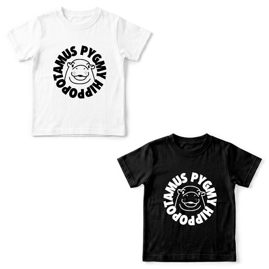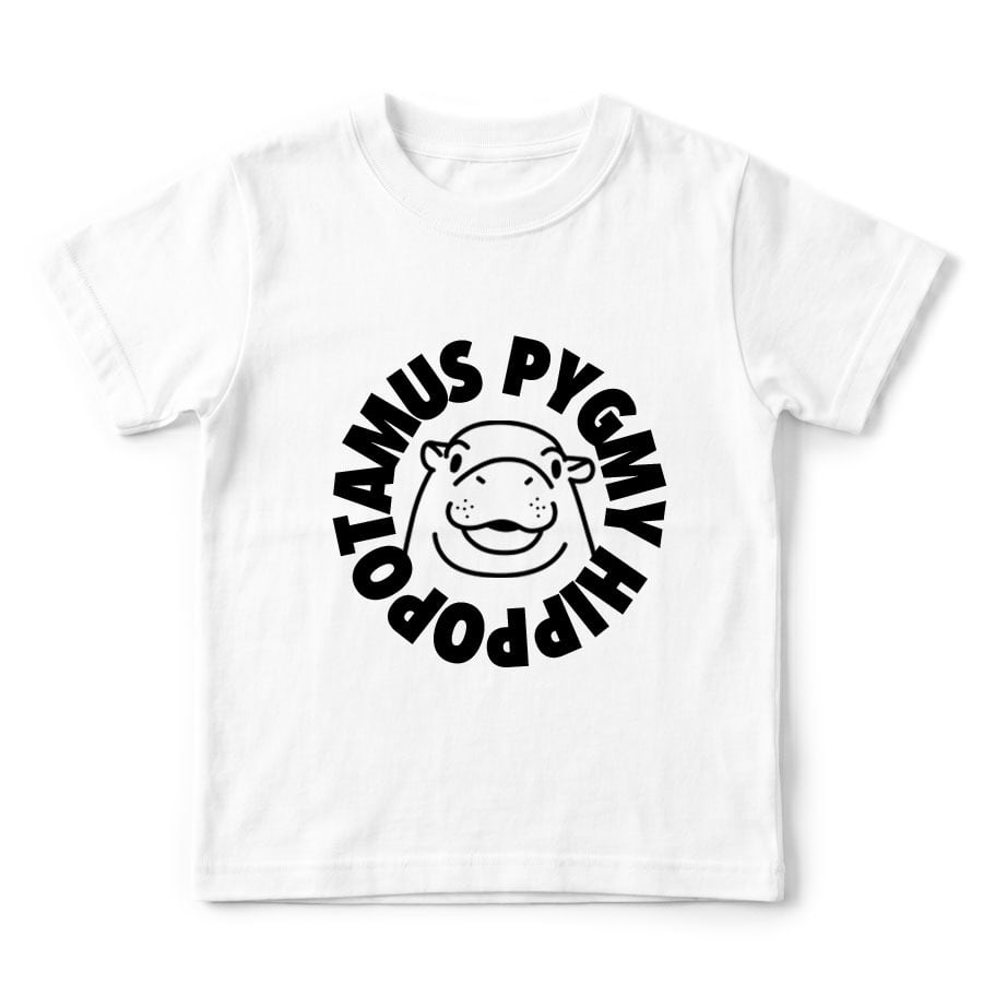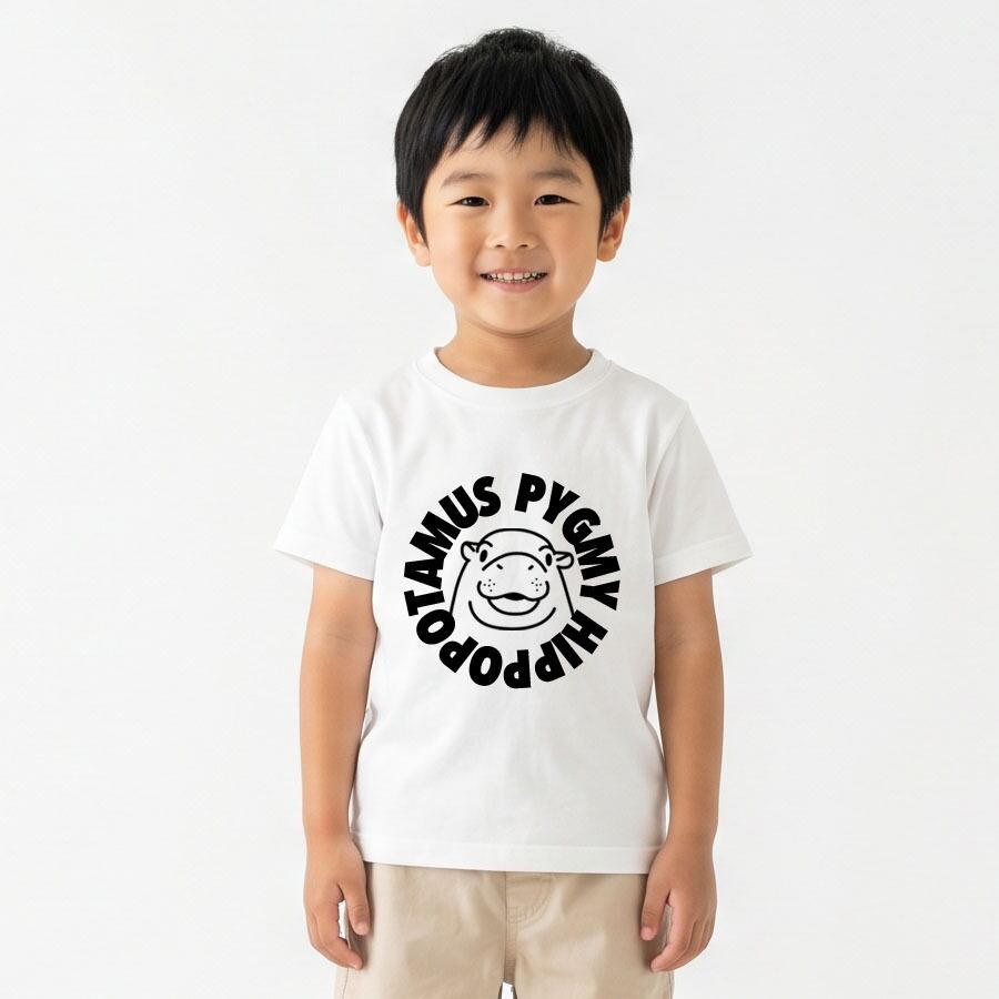 半袖Tシャツ カットソー トップス ミドル丈 ユニセックス キッズ 子供 小人 サイズ 100 110 120 130 140 150 キッズファッション ロゴ Uネック クルーネック おしゃれ おもしろ かわいい ネタ 面白 ユニーク オリジナル ビッグシルエット ルームウェア 普段着 部屋 アウトドア タウンユース カジュアルコーデ パジャマ オールシーズン 春夏秋冬 パロディ プリント グラフィック アニメ マンガ イラスト デザイン 家庭洗濯 コットン生地 白 黒 アイコン アニマル 動物 コビトカバ 赤ちゃん ピグミー ミーム ムーデン Moo Deng
