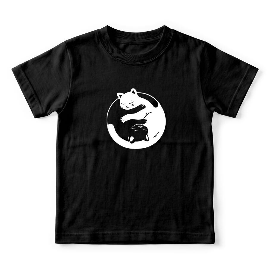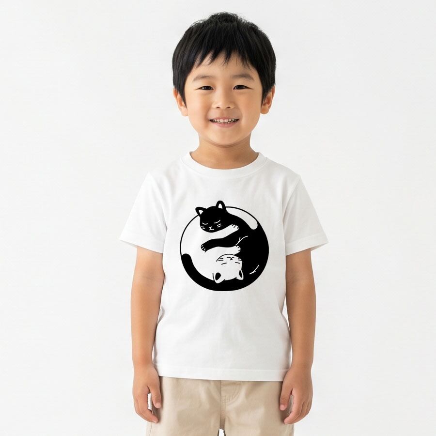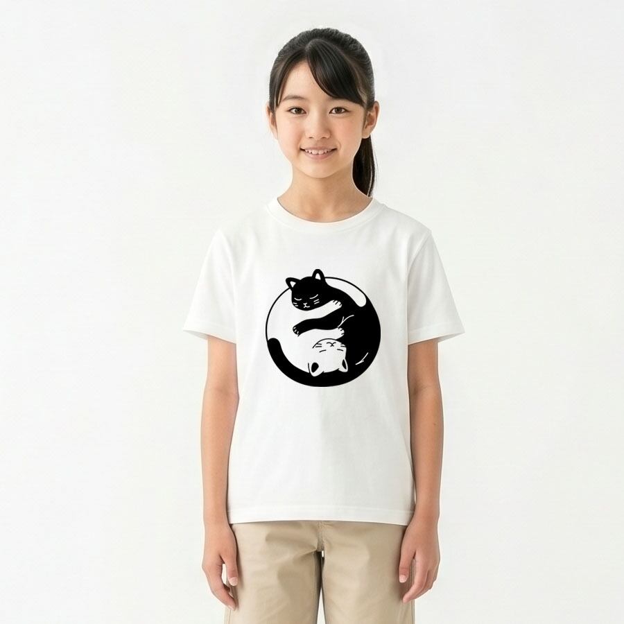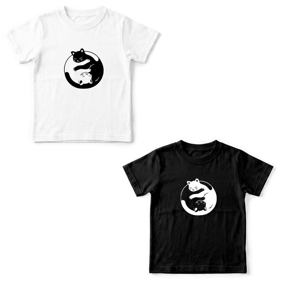 半袖Tシャツ カットソー トップス ミドル丈 ユニセックス キッズ 子供 小人 サイズ 100 110 120 130 140 150 キッズファッション ロゴ Uネック クルーネック おしゃれ おもしろ かわいい ネタ 面白 ユニーク オリジナル ビッグシルエット ルームウェア 普段着 部屋 アウトドア タウンユース カジュアルコーデ パジャマ オールシーズン 春夏秋冬 パロディ プリント グラフィック アニメ マンガ イラスト デザイン 家庭洗濯 コットン生地 白 黒 アイコン アニマル 動物 猫 ネコ CAT ツートン 太極図